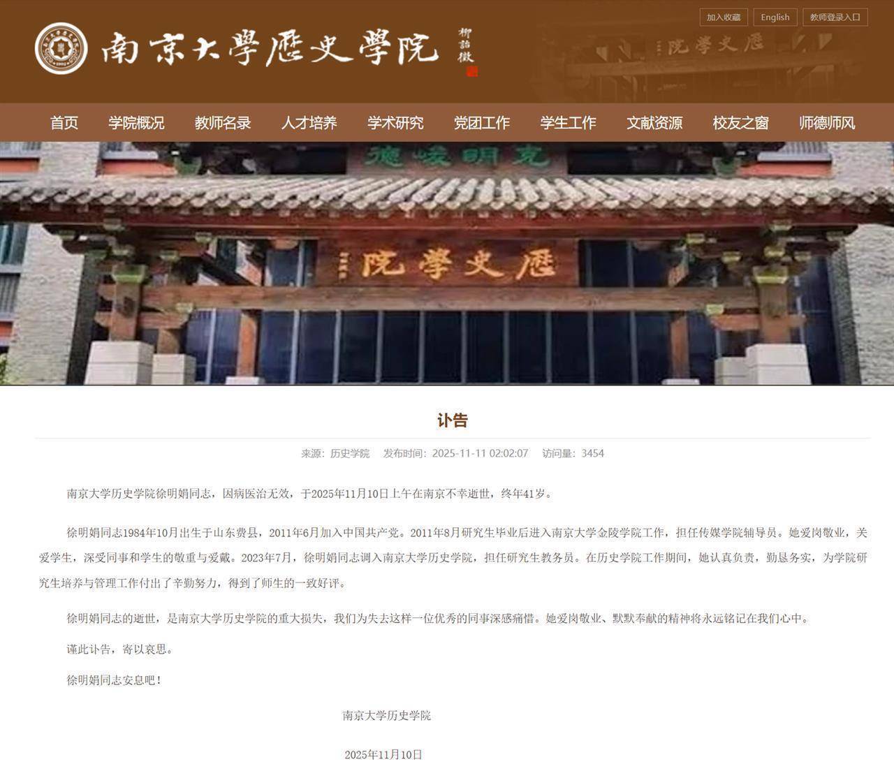 据南京大学历史学院发布讣告,南京大学历史学院徐明娟同志,因病医治无效,于2025年11月10日上午在南京不幸逝世,终年41岁。