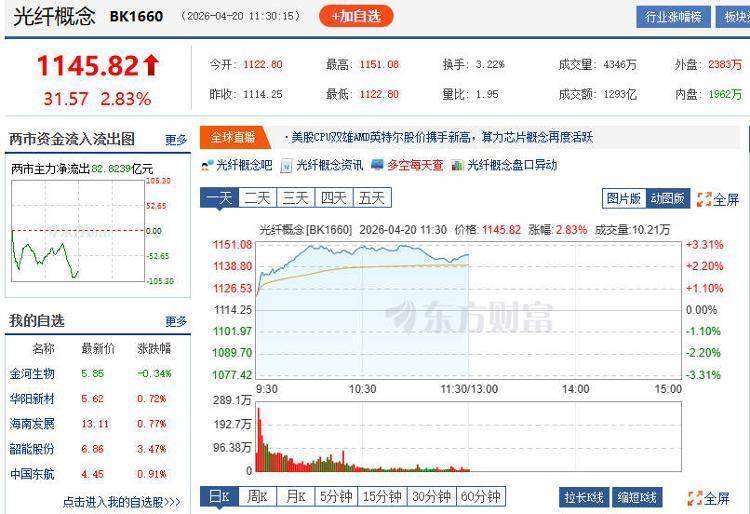 中新经纬4月20日电 (宋亚芬)4月20日,光纤概念股再次爆发。截至上午11时30分股票配资交易网,光纤概念(BK1660)板块指数报1145.82点,盘中涨幅最高超3%。
