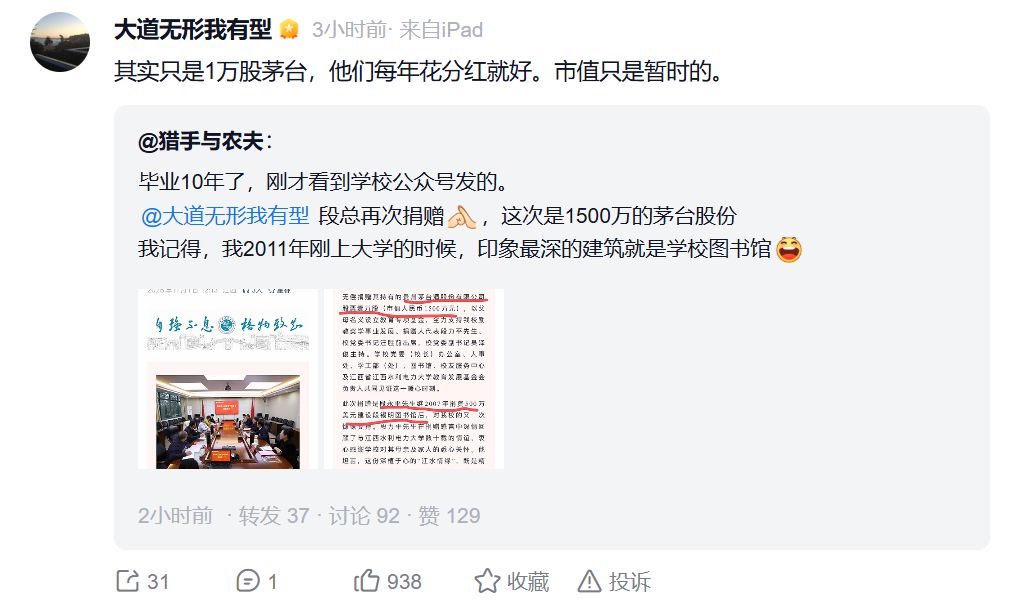 对此,段永平在个人账号上发文称:“其实只是1万股茅台,他们每年花分红就好。市值只是暂时的。”