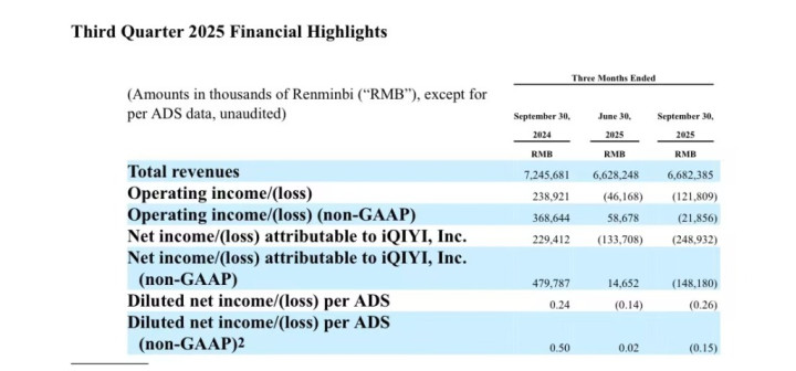 11月18日,爱奇艺公布2025年第三季度财报。该季度爱奇艺实现营业收入66.8亿元,同比下降约8%,环比增长1%;不按美国通用会计准则,归属于爱奇艺的净亏损为1.482亿元,而上年同期净利润为4.798亿元。