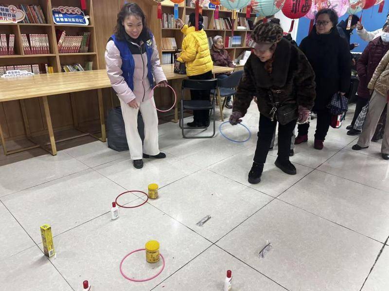 活动前,益心社工与志愿者提前抵达现场布置,悬挂起元宵灯笼和灯谜条,摆放好套圈游戏奖品,营造出浓厚的节日氛围。此次活动设置趣味套圈、灯谜竞猜、暖心送汤圆三大环节,保障到场老年居民都能感受到节日快乐。
