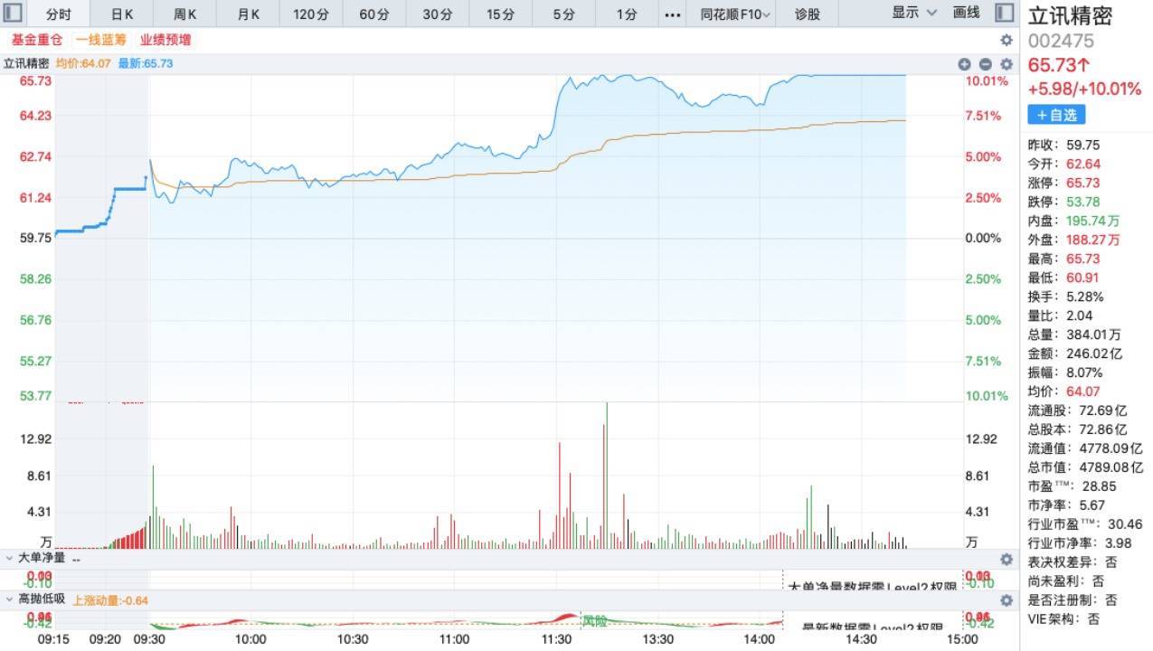 立讯精密今日强势高开最大的股票配资公司,随后整体呈现震荡上行的走势,午后10CM涨停,股价报65.73元/股,总市值为4789.08亿元,截至发稿未打开涨停板。