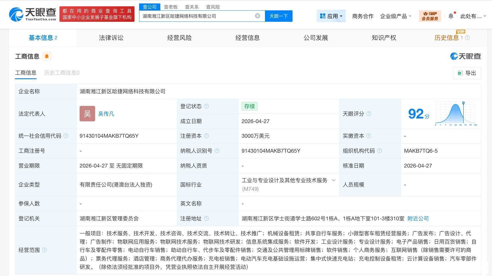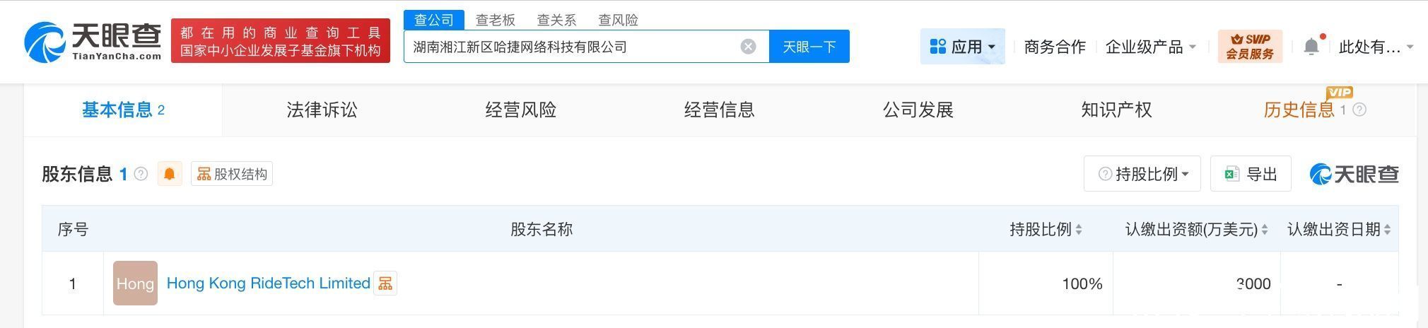 天眼查工商信息显示,近日,湖南湘江新区哈捷网络科技有限公司成立,法定代表人为吴传凡,注册资本3000万美元,经营范围包括共享自行车服务、小微型客车租赁经营服务、物联网技术服务、信息系统集成服务、互联网销售、票务代理服务、电动汽车充电基础设施运营等。股东信息显示,该公司由哈啰出行旗下Hong Kong RideTech Limited全资持股。